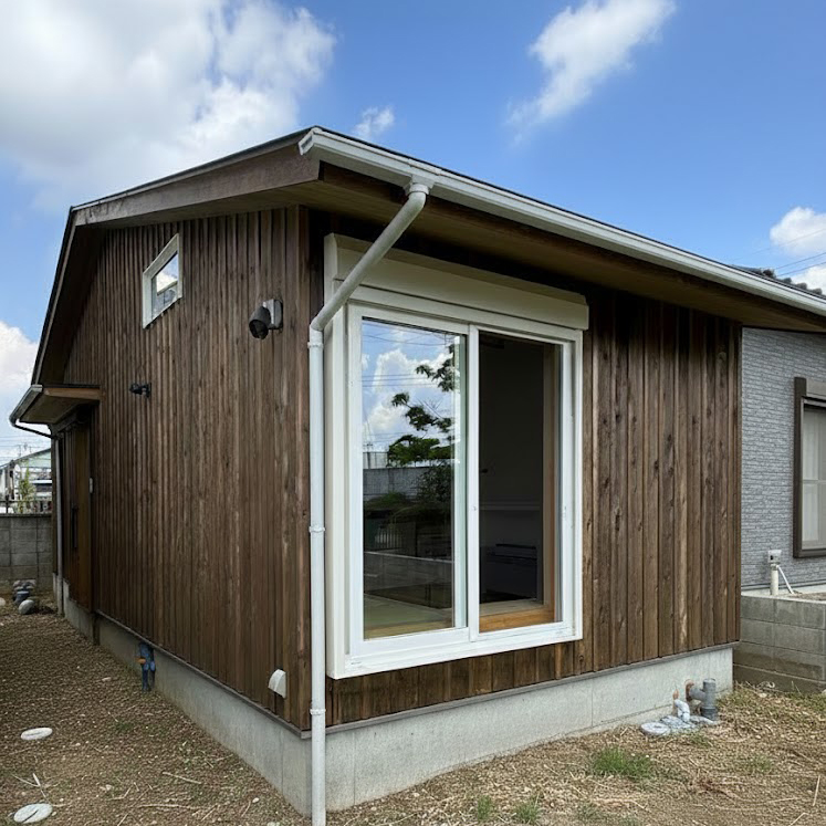 「流山の家」は約10坪の平屋で、杉板の外壁が落ち着いた外観になってます。