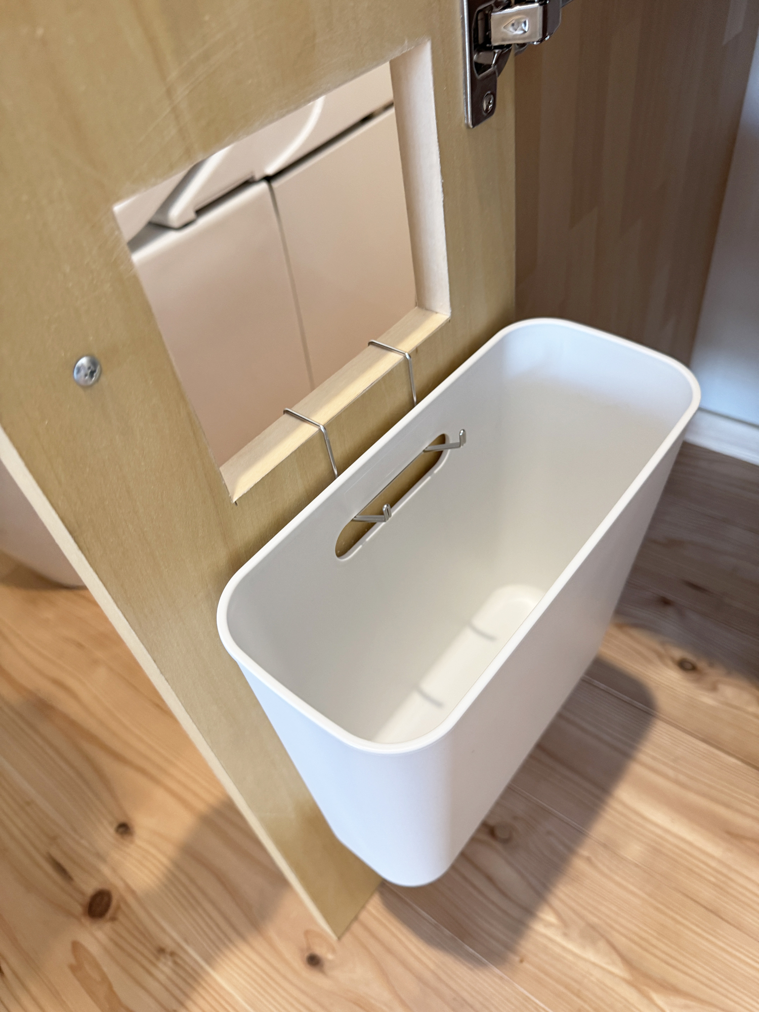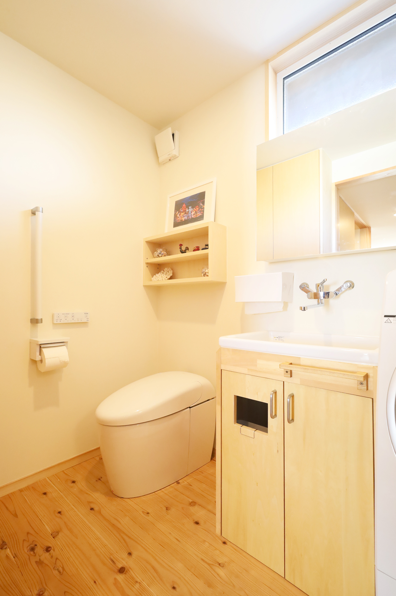 トイレと一体になった洗面室は、洗面台の扉に穴を開けて