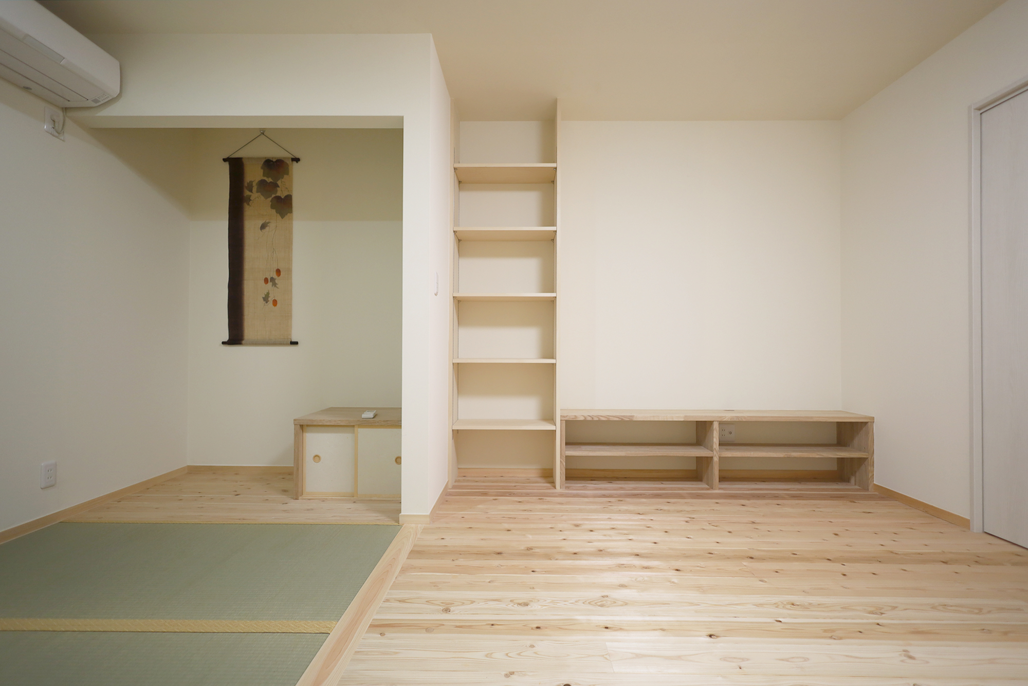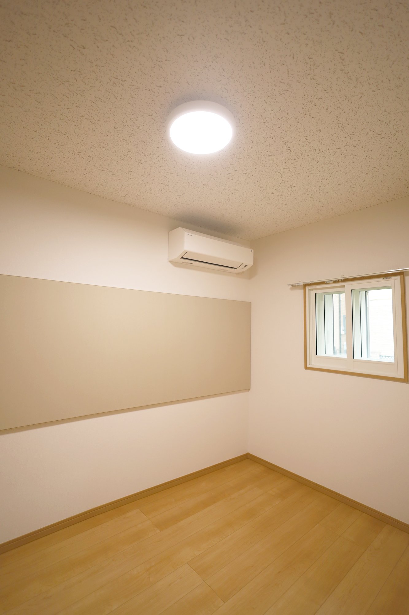 外壁はクリーム系のモルタル吹付け、内壁と天井はエッグパルプ、床は杉板で、自然素材たっぷりの安心できる気持ちの良い空間になりました。